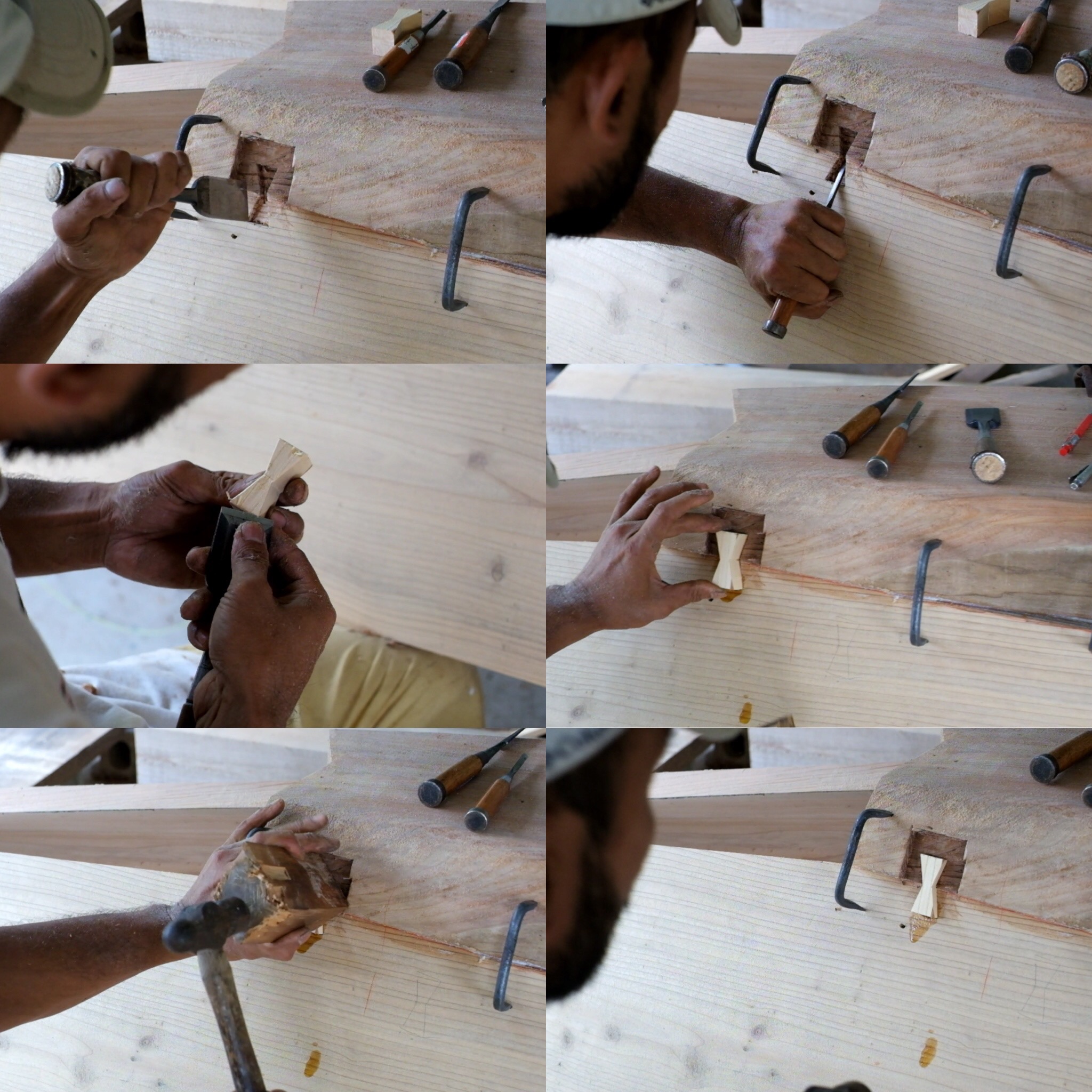 In sostituzione dei chiodi, clessidre di inumaki (podocarpus macrophyllus, “chaghì” nella lingua locale) impediscono il distacco dei pezzi assemblati, mentre dei “ganci” di bambù, grazie alla loro elasticità, impediscono il movimento laterale.
