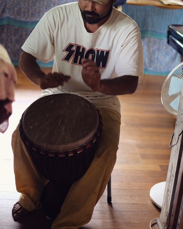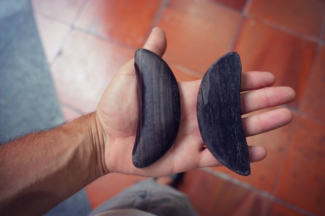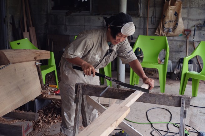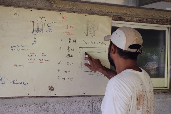 Sono trascorsi ormai cinque anni dal giorno in cui Yoshi bussò alla porta del mestro Arashiro di Ishigaki, già ottantenne, e depositario della tecnica della costruzione del sabani. Da quel giorno le due passioni di Yoshi, il legno e il mare, si sono unite ed è iniziata la sua nuova vita. Ci racconta di come sia sempre stato affascinato dal legno mentre ci mostra il tamburo scolpito durante uno dei suoi soggiorni in India, a Rishikesh, nella stessa scuola in cui Hiro (che coincidenza! È stato Hiro a farci assaggiare le vipere a Iriomote) ha imparato a fare i deejiridu.
