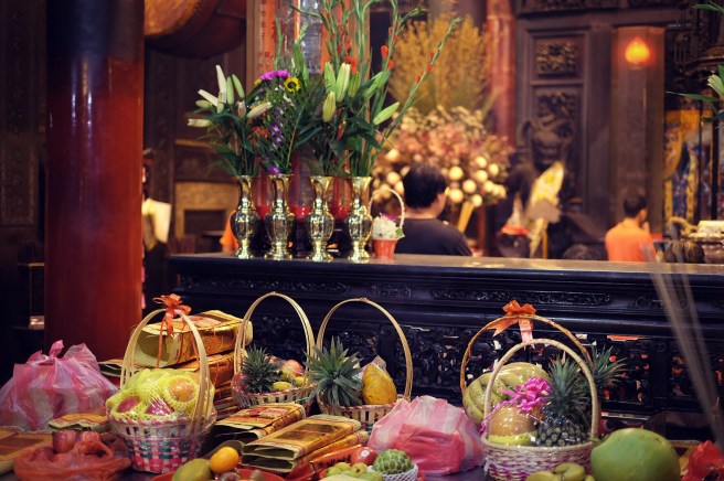 Fiori, frutta, soldi finti (e ultimamente anche iPhone di carta) sono solo degli esempi di offerte che si portano nei templi, perché le divinità hanno in fondo i nostri stessi bisogni. Stessa cosa vale per i defunti: durante la veglia funebre – che dura una settimana – vicino al corpo viene allestita una casa di cartone, una riproduzione idilliaca e lussuosa con anche guardiano e maggiordomo e un “set” di cibo (vero). Secondo la credenza, nei primi sei giorni l’anima prende e porta con sè tutto ciò di cui avrà bisogno nell’aldilà e il settimo giorno si puo procedere con il funerale. In questo ultimo giorno, casa, soldi, iPhone finti e computer di carta vengono bruciati, mentre il cibo viene spartito tra i familiari.