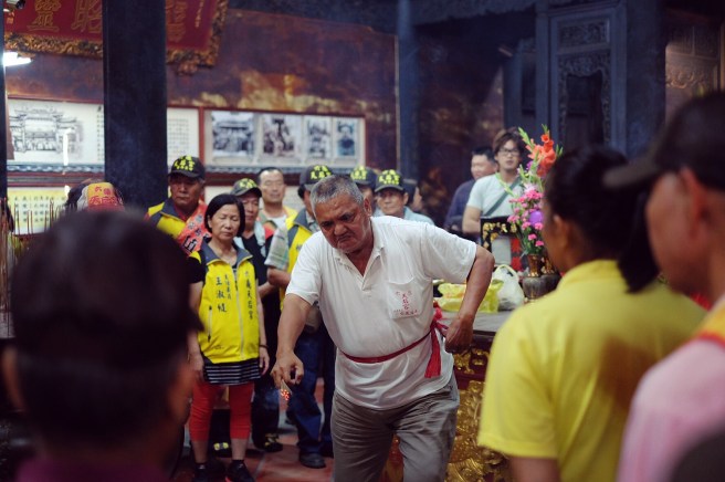 Lukang, all’interno del tempio un uomo (all’apparenza posseduto) si dimena dopo essersi passato sul palmo della mano gli incensi accesi.