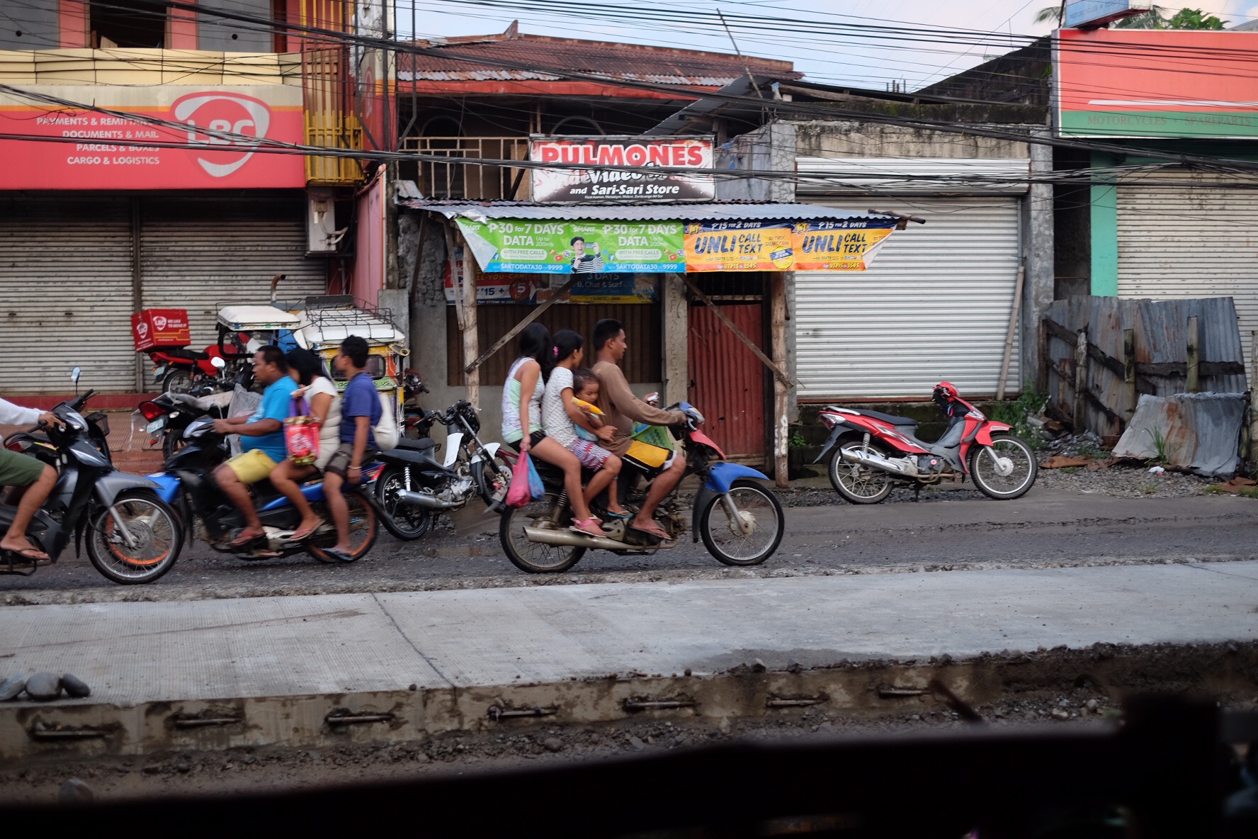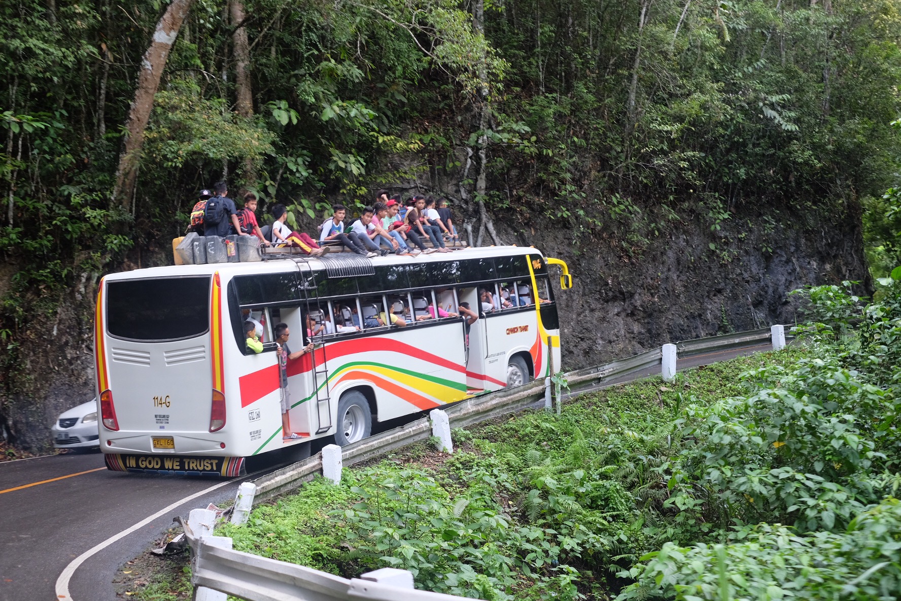 Viaggiare su strada nelle Filippine, volente o nolente ti rimette in contatto diretto – e stretto – con la gente perché non esistono più biglietterie, centri informazione, opuscoli e numeri a cui chiedere. Tutto diventa possibile, puoi fermare un bus ovunque, salirci anche se pare non ci sia spazio per una mosca, saltare sul tetto di una jeepney se è piena, andare in quattro – o cinque o sei – su un motorino e sbizzarrire la fantasia nell’assenza totale di regole.