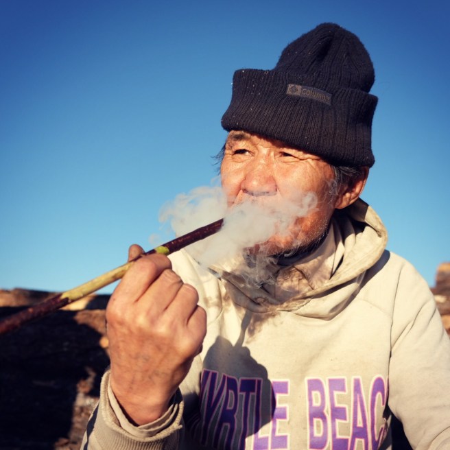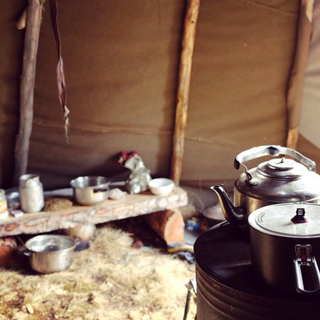 Con la pancia piena di borzog ed eccitati dal nuovo incarico (all’inizio pensavamo che ci dicessero di dover andare via) rientriamo in tenda per la quasi consueta minestra. Oltre ad Ocerbat e suo figlio (si, l’abbiamo scoperto anche noi in questo momento), ci sono due filettini di carne che sfrigolano sul coperchio della stufa: pensiamo che sia renna, invece è il risultato di una fortuita caccia all’ermellino. La pelliccia dell’animale perfettamente scuoiato – senza che muso, corpo o zampe si siano rovinati – penzola già all’interno della tenda. Stando a quello che abbiamo potuto capire, l’animale si era incautamente rifugiato su un albero e lui, per non farsi sfuggire l’occasione di mettere sul piatto un po’ di proteine, ha risvegliato in un attimo il suo istinto e ha colpito l’animale lanciando un ciocco di legno. Difficile immaginare il pacato e quasi svogliato Ocerbat in una veste così scattante!