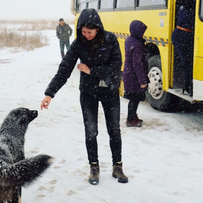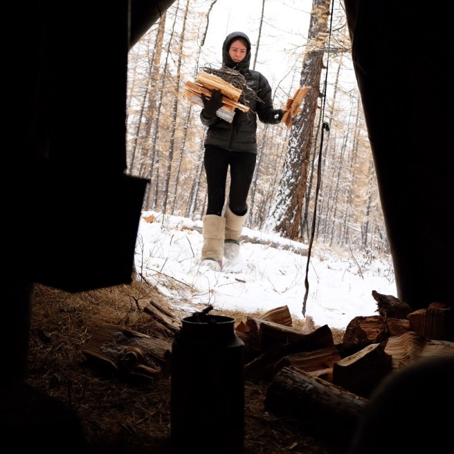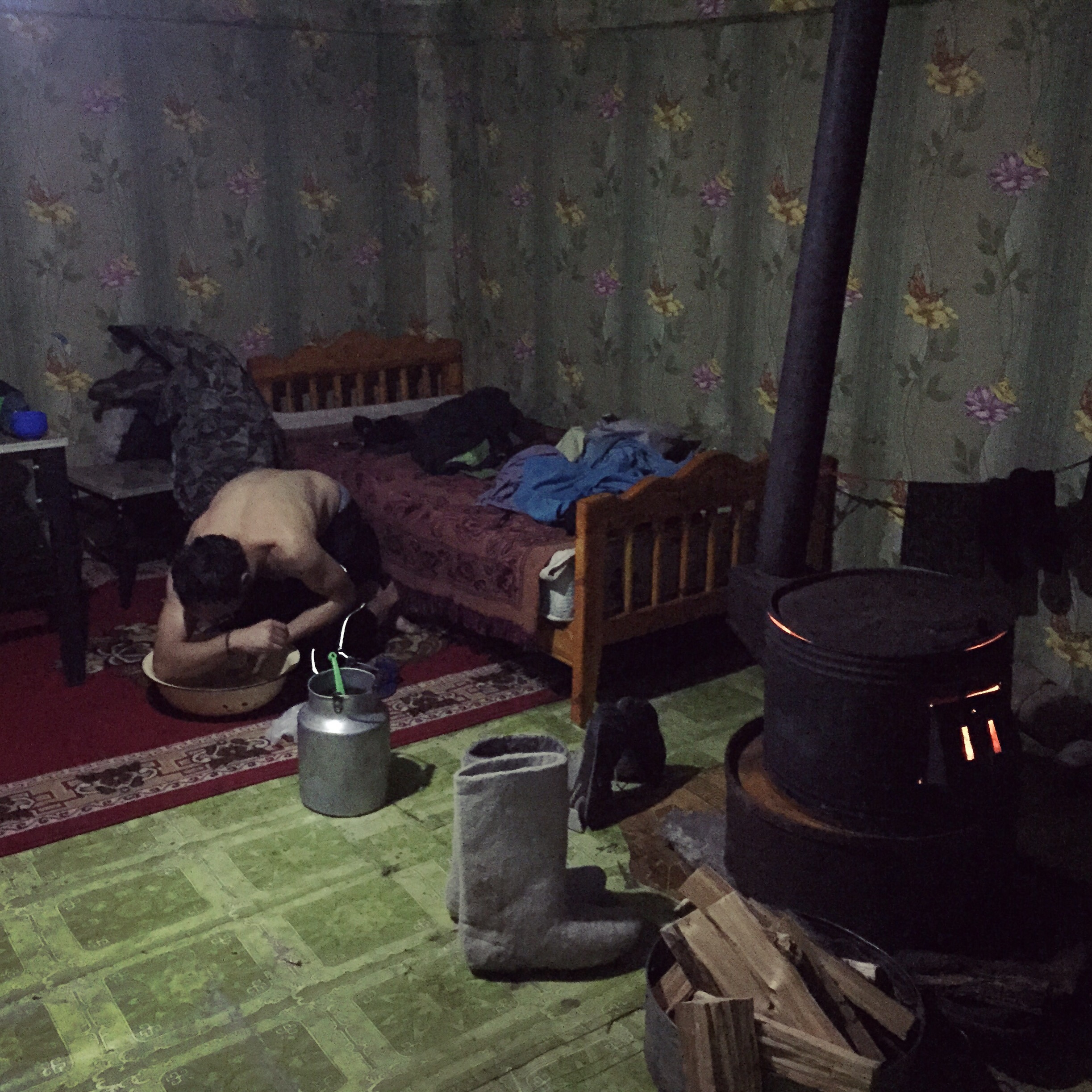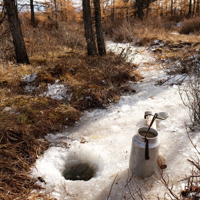 Nonostante la comunicazione resti l’ostacolo più grande, Ocerbat ci mostra dove prendere l’acqua – c’è un torrente ghiacciato ad un centinaio di metri con un buco da cui attingere – e spontaneamente lo aiutiamo a spaccare la legna. Con un piccolo quadernino e una biro iniziamo a dare forma al nostro personale vocabolario illustrato della taiga.