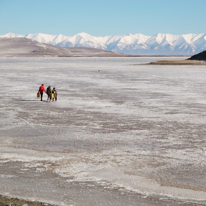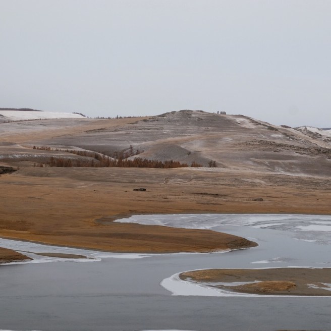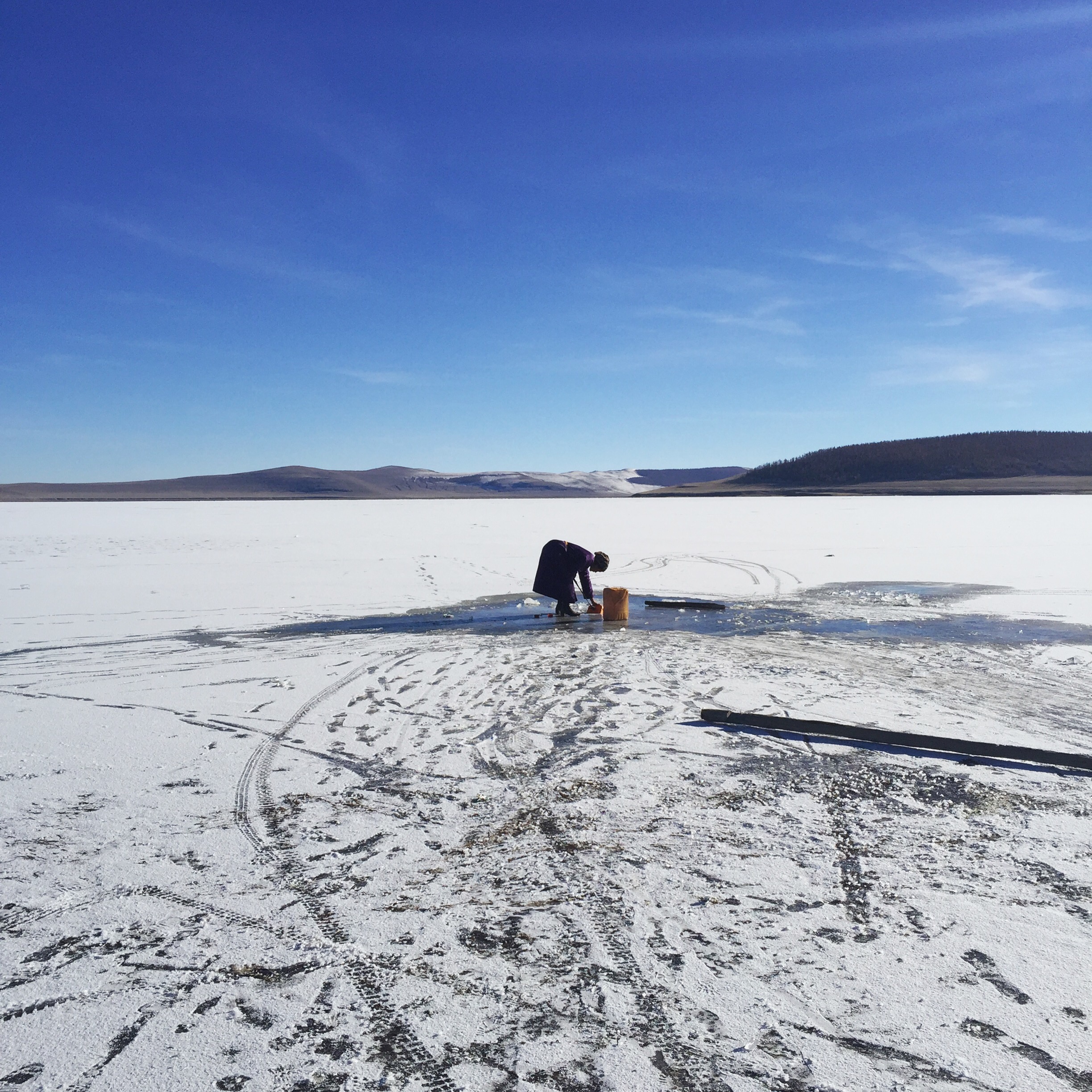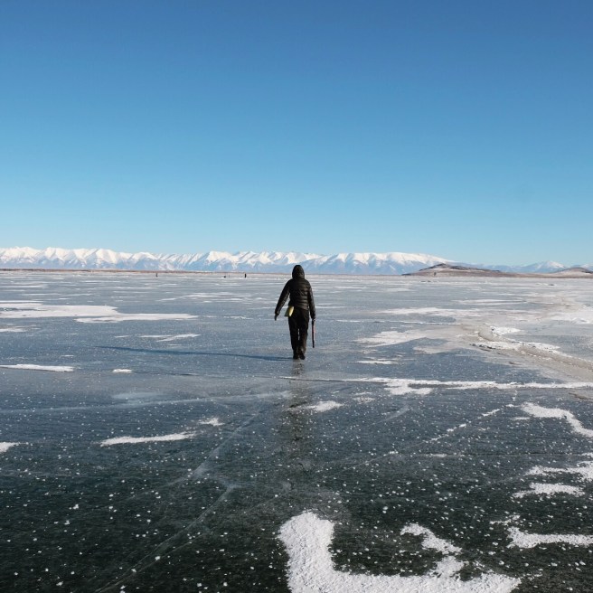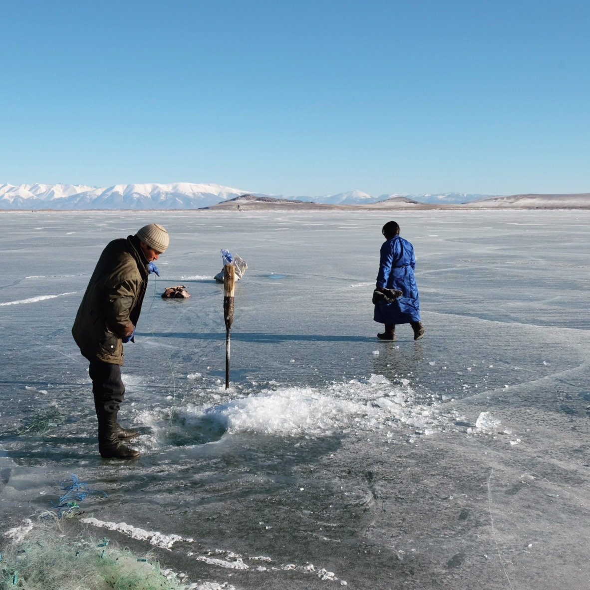 Bayarhu ci accoglie stupito, non riesce a credere che siamo tornati a piedi dalla taiga correndo il rischio di farci attaccare dai lupi (noi a dire il vero non sapevamo di questo pericolo) e subito ci accende la stufa. Le nostre quattro mura ci ora sembrano più familiari che mai. Per i giorni a seguire, ogni mattina sua moglie ci porterà un piatto con due pesci e del riso, forse anche lei ha letto la fame nei nostri occhi! A proposito di pesci! Andiamo alla ricerca di Gambat, il fumatore di pipa che ci aveva invitato a pescare. Bussiamo alla sua porta ma la moglie ci fa segno di andare a cercarlo sul lago. Muovere i primi passi sulla superficie ghiacciata da soli non è rassicurante e mano a mano che ci si allontana dalla costa la sensazione peggiora. Pur vedendo in lontananza diversi gruppi di pescatori e addirittura un furgoncino che passa indisturbato, i rumori indescrivibili che gli enormi blocchi di ghiaccio fanno stritolandosi tra loro ci fanno sentire sul filo del rasoio.