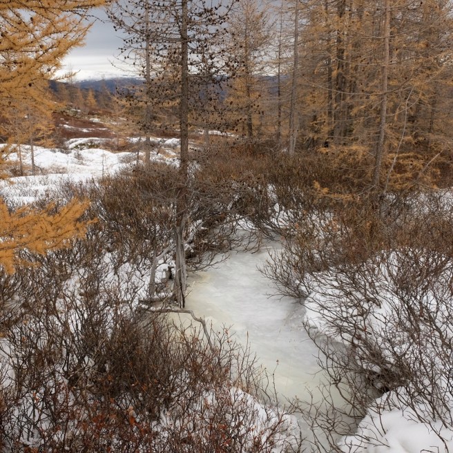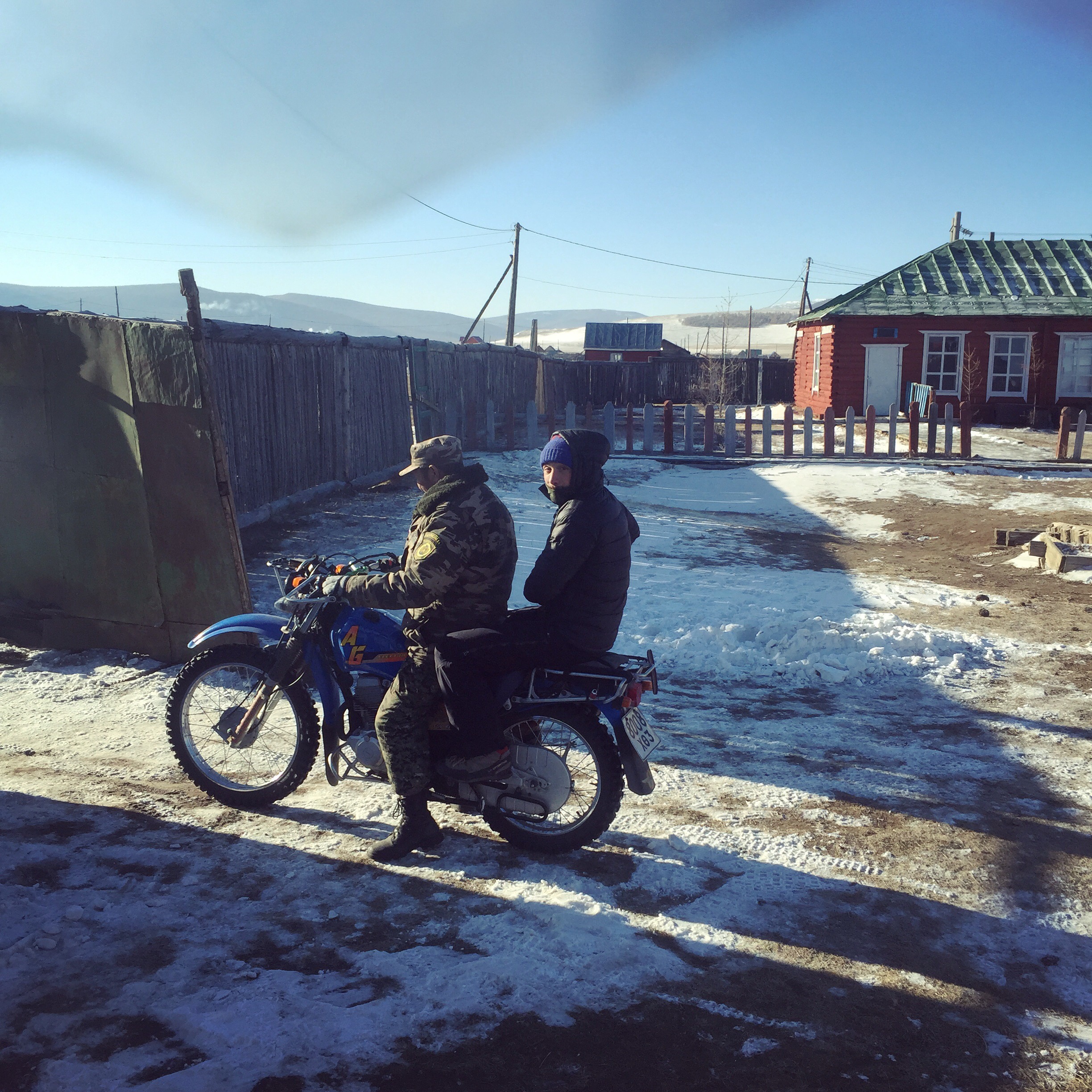 Due moto. Nulla come due ruote sotto il sedere e le sferzate di aria in pieno viso danno il senso di avventura e libertà. Alla guida di una delle due Bayarhu, competente, veloce, sicuro. Sull’altra un personaggio sorridente ma traballante, sempre a gambe larghe (meglio che all’aria) che affronta con poca spavalderia le gobbe e le buche della pista. Un’ora e mezza, bardati come mai, ed iniziamo ad addentrarci nella taiga. La pista diventa un sentiero di fango congelato coperto da un leggero strato di neve, i guadi dei torrenti sono lastre di ghiaccio e la vegetazione inizia a farsi più fitta.