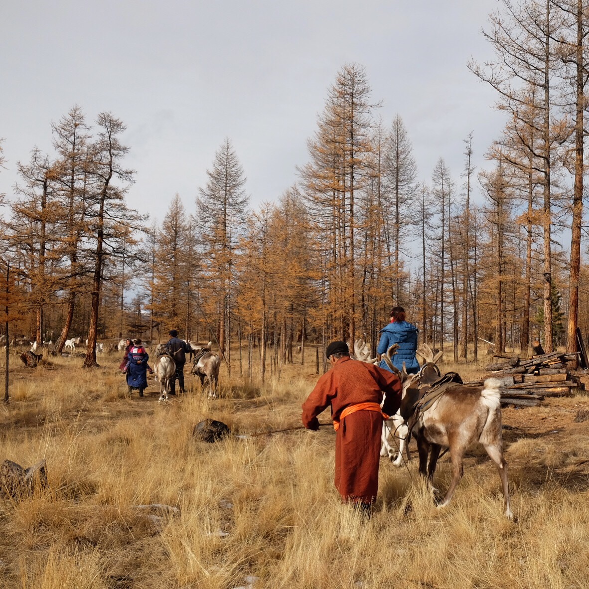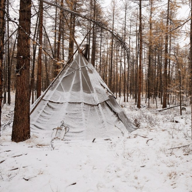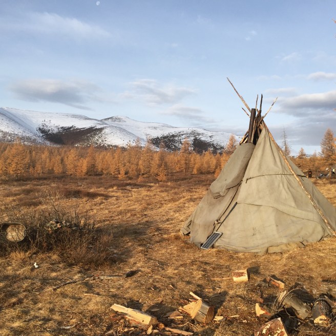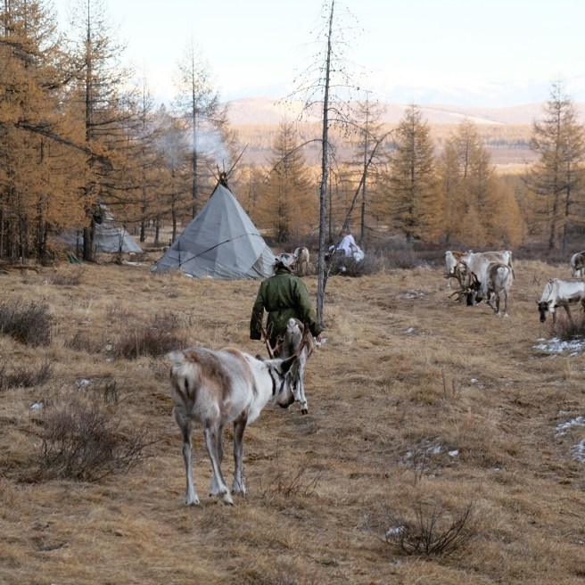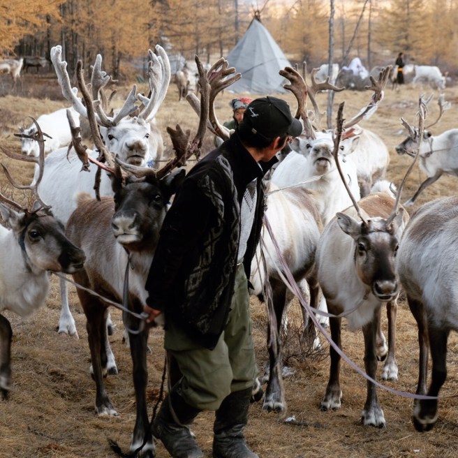 Arriviamo in una radura, ma sembra un campo abbandonato, quasi desolato. Qualche bambino, dei cani lupo, un anziano: rivolgono a mala pena la parola a Bayrahu che chiede dove sia il campo. I nostri timori sulla tensione tra di loro iniziano a rivelarsi fondati e temiamo di non essere accettati e di dover tornare indietro. Fortunatamente il nostro centauro barcollante sembra aver mantenuto migliori i contatti con gli Tsaatan (letteralmente gli “uomini-renna”) e dopo una telefonata ci guida sicuro attraverso un sentiero in mezzo a larici dorati: bambini dai sorrisi viola di mirtillo spuntano da dietro i cespugli e alcune renne fanno capolino. Una radura ancor più ampia si apre davanti a noi e si iniziano ad intravedere quattro o cinque tende tipiche di questa tribù nomade, più simili ai “teepee” degli indiani d’America che alle classiche “gher” mongole.