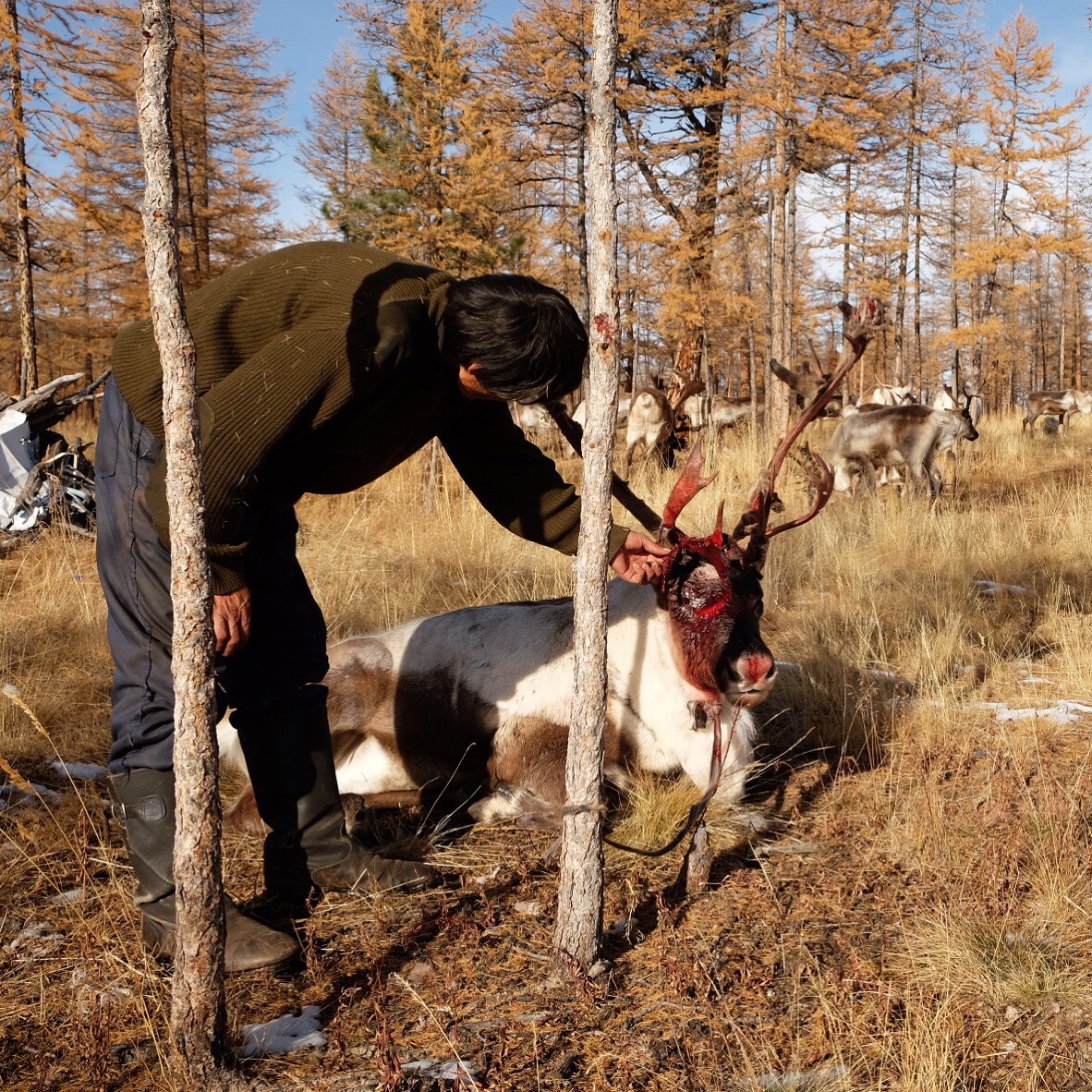 Gli Tsaatan hanno inoltre l’accortezza di stringere uno spago alla base della parte di corno che verrà segato per evitare l’afflusso del sangue nel velluto. I cani infine assistono impazienti a questa operazione perché sanno che il velluto staccato dalle corna fresche di taglio spetta a loro: niente viene sprecato!