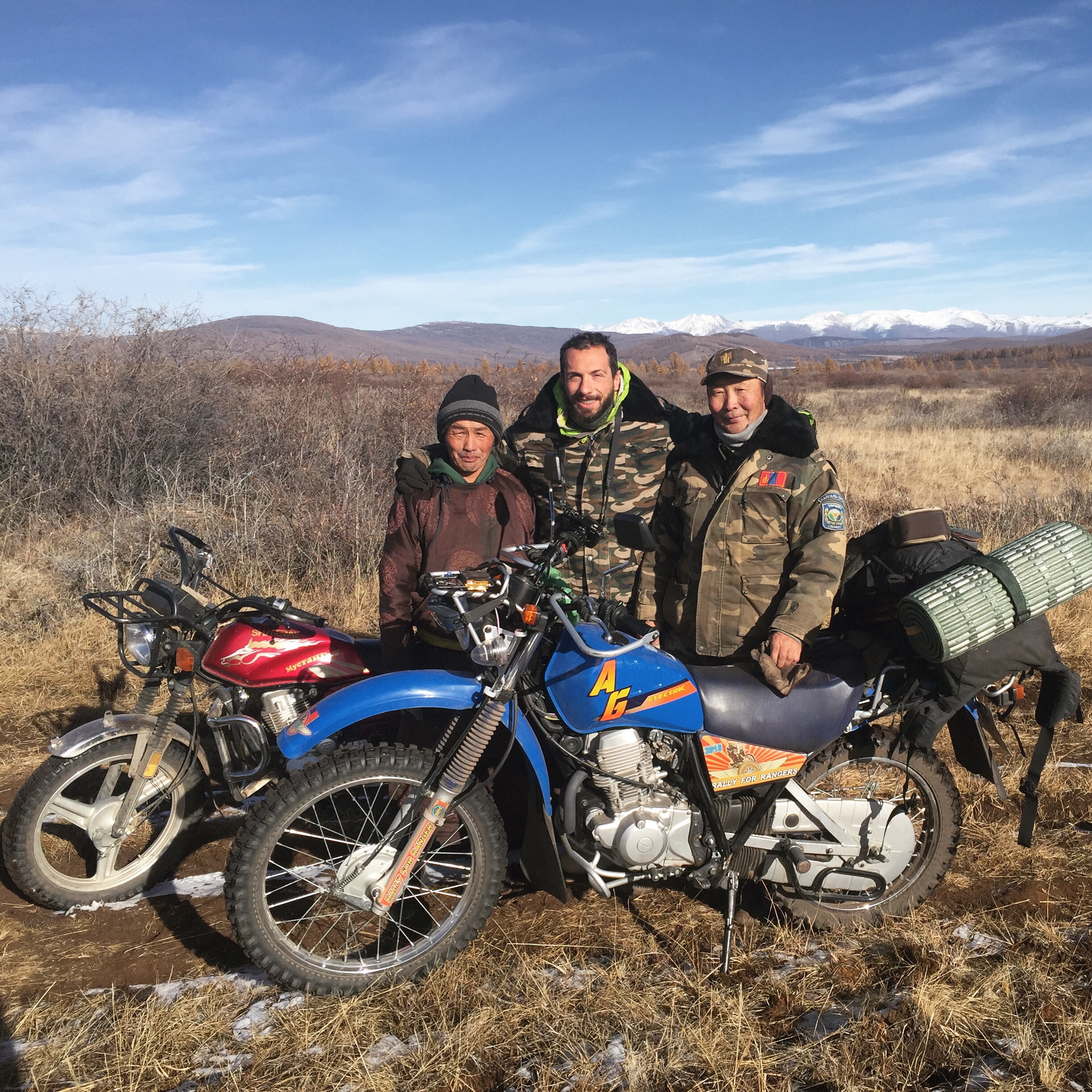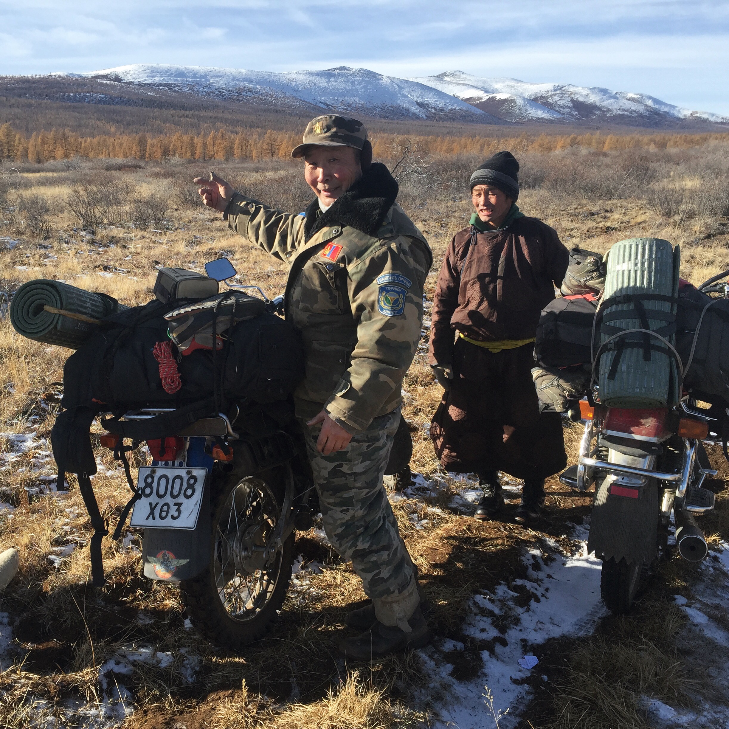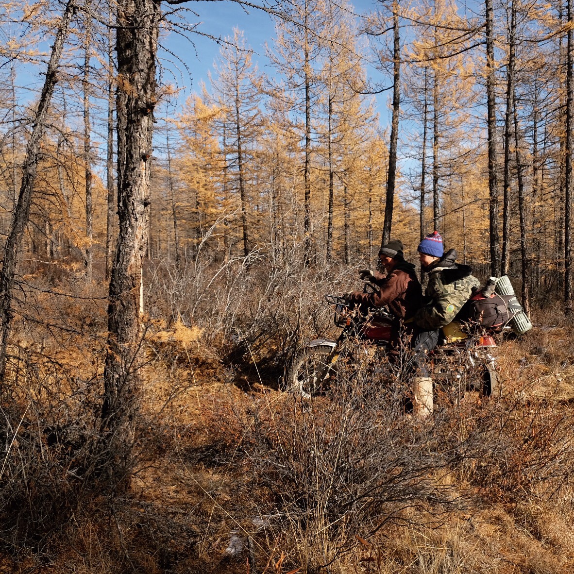Due moto. Nulla come due ruote sotto il sedere e le sferzate di aria in pieno viso danno il senso di avventura e libertà. Alla guida di una delle due Bayarhu, competente, veloce, sicuro. Sull’altra un personaggio sorridente ma traballante, sempre a gambe larghe (meglio che all’aria) che affronta con poca spavalderia le gobbe e le buche della pista. Un’ora e mezza, bardati come mai, ed iniziamo ad addentrarci nella taiga. La pista diventa un sentiero di fango congelato coperto da un leggero strato di neve, i guadi dei torrenti sono lastre di ghiaccio e la vegetazione inizia a farsi più fitta.