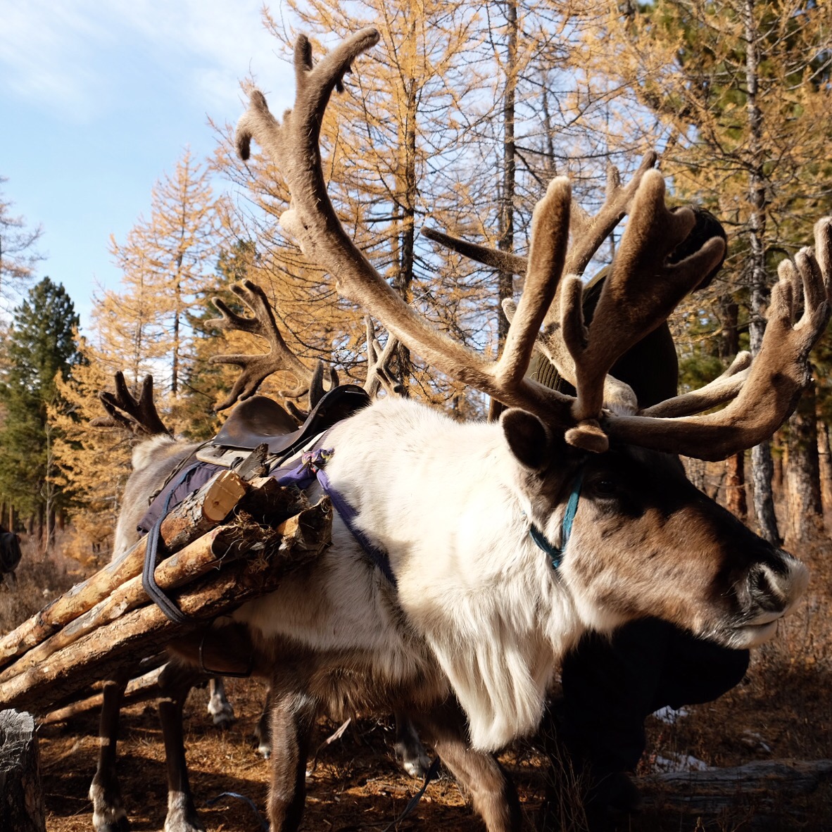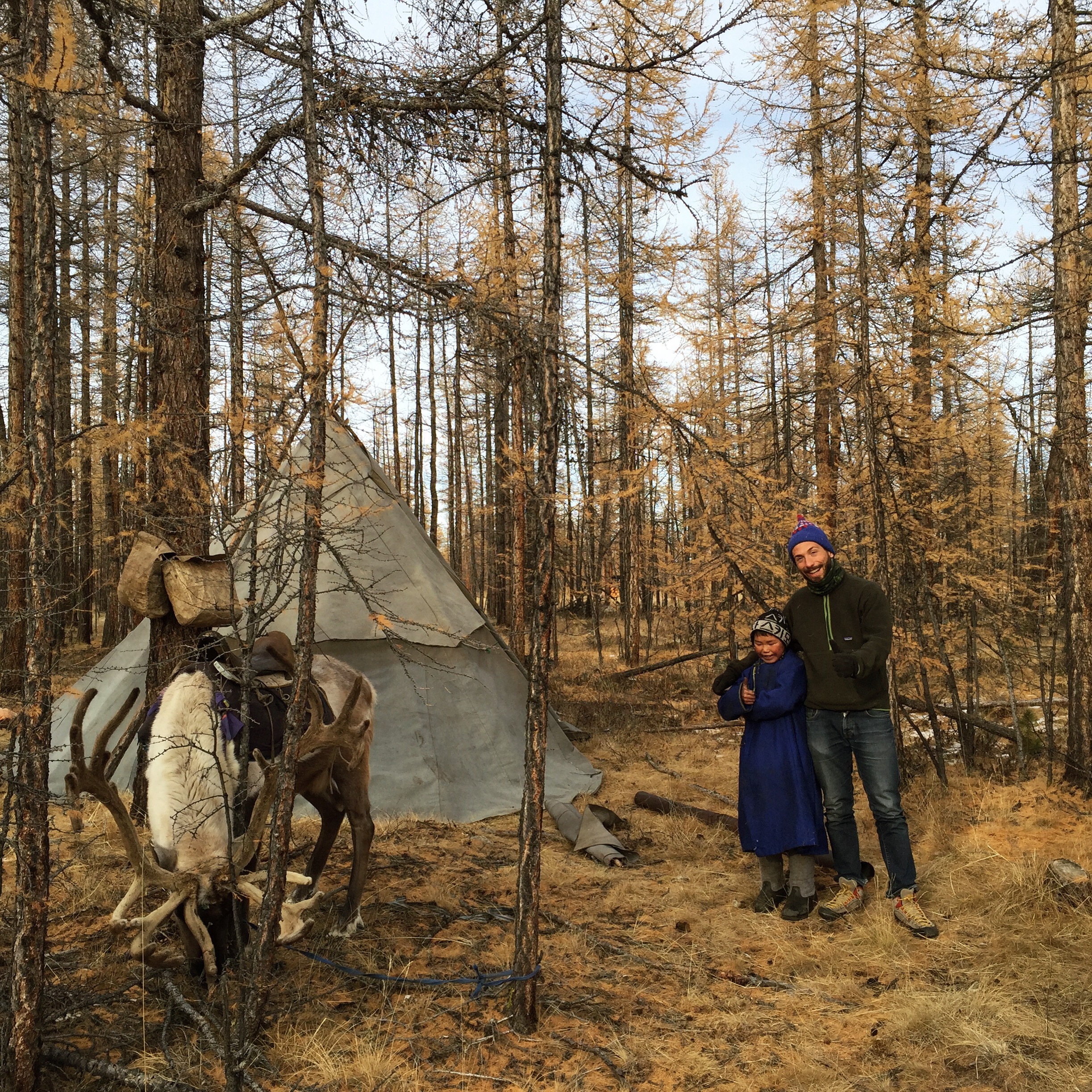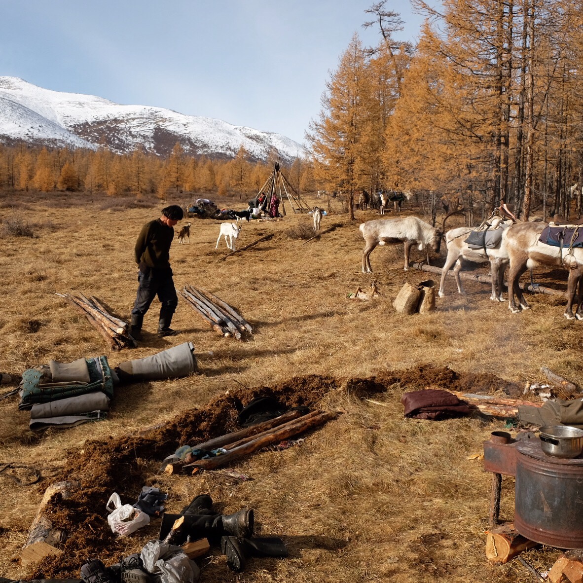 Arriviamo in una radura, ma sembra un campo abbandonato, quasi desolato. Qualche bambino, dei cani lupo, un anziano: rivolgono a mala pena la parola a Bayrahu che chiede dove sia il campo. I nostri timori sulla tensione tra di loro iniziano a rivelarsi fondati e temiamo di non essere accettati e di dover tornare indietro. Fortunatamente il nostro centauro barcollante sembra aver mantenuto migliori i contatti con gli Tsaatan (letteralmente gli “uomini-renna”) e dopo una telefonata ci guida sicuro attraverso un sentiero in mezzo a larici dorati: bambini dai sorrisi viola di mirtillo spuntano da dietro i cespugli e alcune renne fanno capolino. Una radura ancor più ampia si apre davanti a noi e si iniziano ad intravedere quattro o cinque tende tipiche di questa tribù nomade, più simili ai “teepee” degli indiani d’America che alle classiche “gher” mongole.