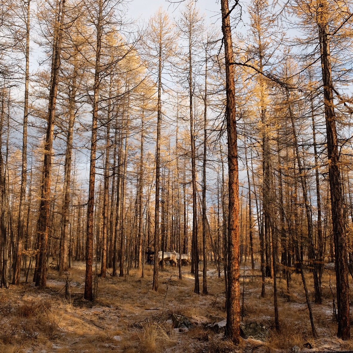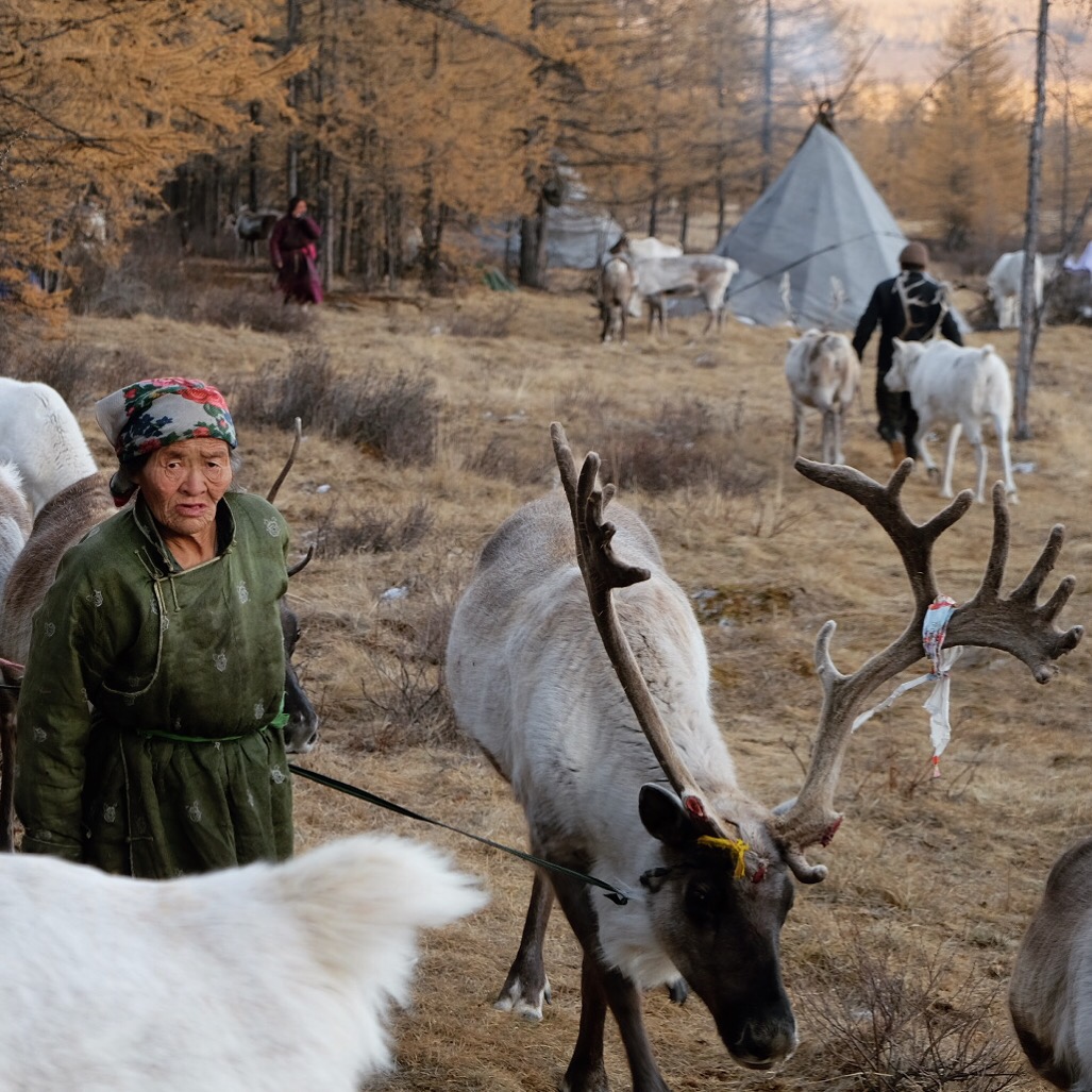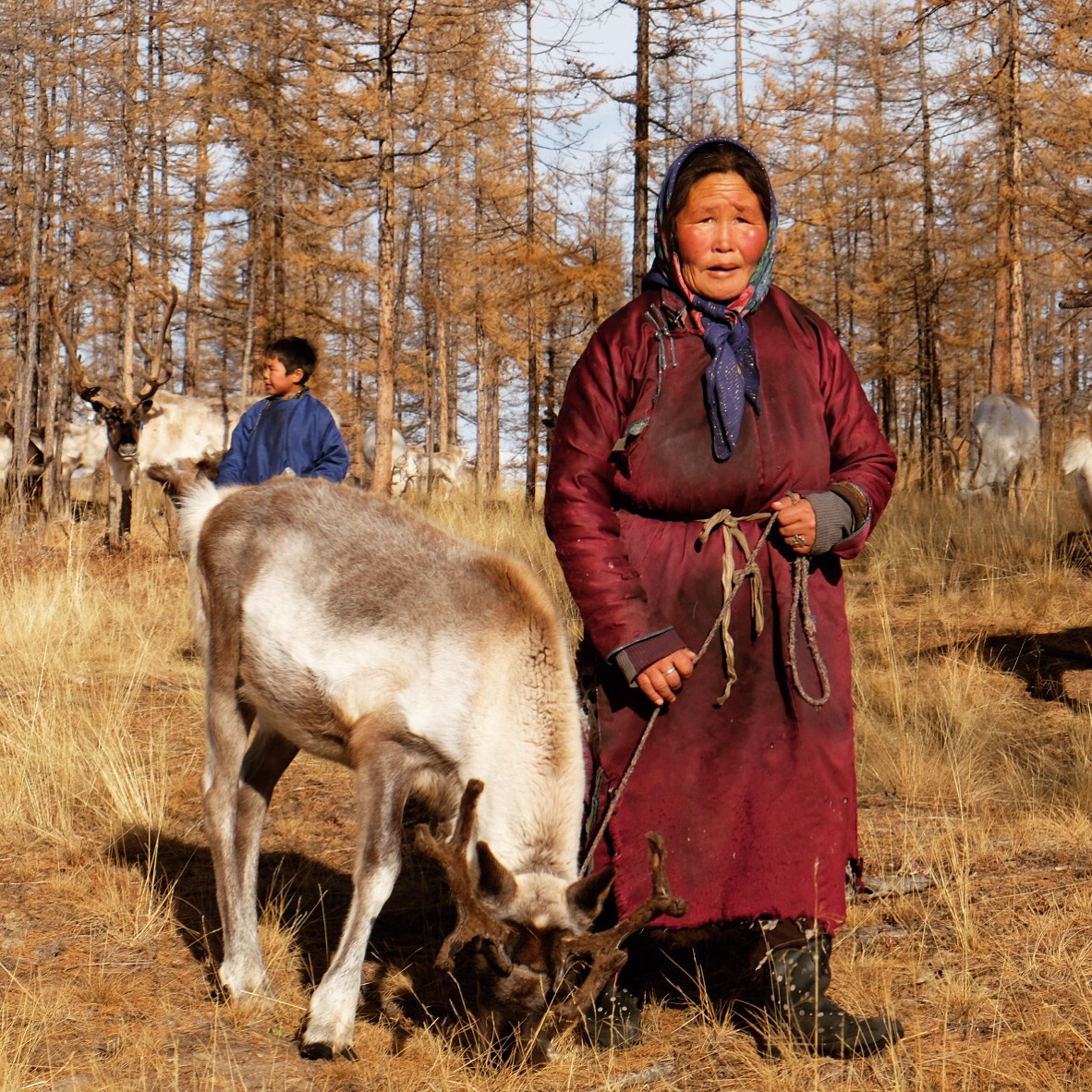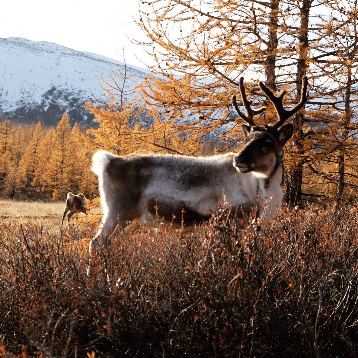 Arriviamo in una radura, ma sembra un campo abbandonato, quasi desolato. Qualche bambino, dei cani lupo, un anziano: rivolgono a mala pena la parola a Bayrahu che chiede dove sia il campo. I nostri timori sulla tensione tra di loro iniziano a rivelarsi fondati e temiamo di non essere accettati e di dover tornare indietro. Fortunatamente il nostro centauro barcollante sembra aver mantenuto migliori i contatti con gli Tsaatan (letteralmente gli “uomini-renna”) e dopo una telefonata ci guida sicuro attraverso un sentiero in mezzo a larici dorati: bambini dai sorrisi viola di mirtillo spuntano da dietro i cespugli e alcune renne fanno capolino. Una radura ancor più ampia si apre davanti a noi e si iniziano ad intravedere quattro o cinque tende tipiche di questa tribù nomade, più simili ai “teepee” degli indiani d’America che alle classiche “gher” mongole.