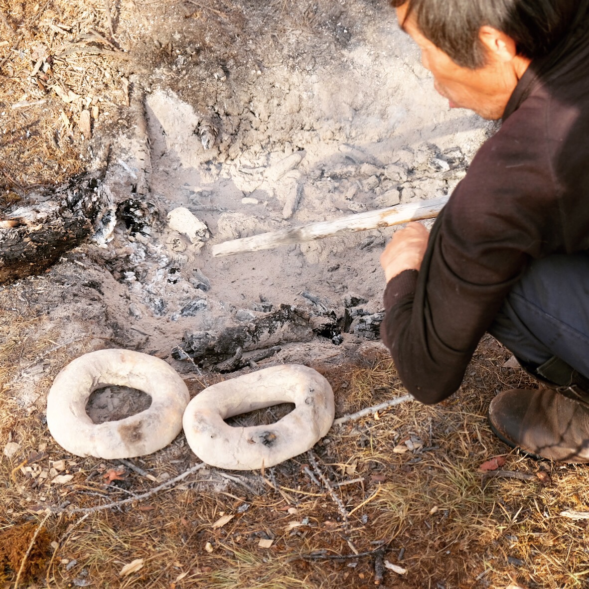 Entriamo nelle varie tende, o meglio, ci facciamo sentire da fuori – non abbiamo ancora superato il naturale blocco a entrare nell’intimità delle tende altrui senza “bussare”, cosa che invece è prassi tra i nomadi – e ci facciamo consegnare qualche secchio vuoto. Renderci in qualche modo utili ci fa sentire parte della comunità. Mentre spacchiamo il ghiaccio con l’ascia e aspettiamo che il livello del torrente risalga per potere continuare a riempire secchielli e teiere, la fame inizia a torturarci i pensieri: polenta oncia e formaggio fuso non ci danno tregua. Ma nella taiga le sorprese non mancano, e se il giorno precedente in cambio del nostro servizio di “acqua a domicilio” ci era stato offerto suutei tsai (tè con latte e sale) con latte di renna e ottimi borzog nella tenda di Toula, la donna più anziana della taiga (62 anni), oggi restiamo senza parole nel vederci offerto del formaggio di renna, squisitamente simile al parmigiano ma dolce, ovviamente accompagnato da suutei tsai e borzog. Quando poi Monodent ci consegna un’intera pagnotta ancora calda, ne divoriamo subito qualche fetta e il resto la portiamo con noi nel sacco a pelo per evitare che si congeli. È l’ultima nostra notte tra gli Tsaatan, ma tutto quello che abbiamo vissuto questa settimana rimarrà indelebile.