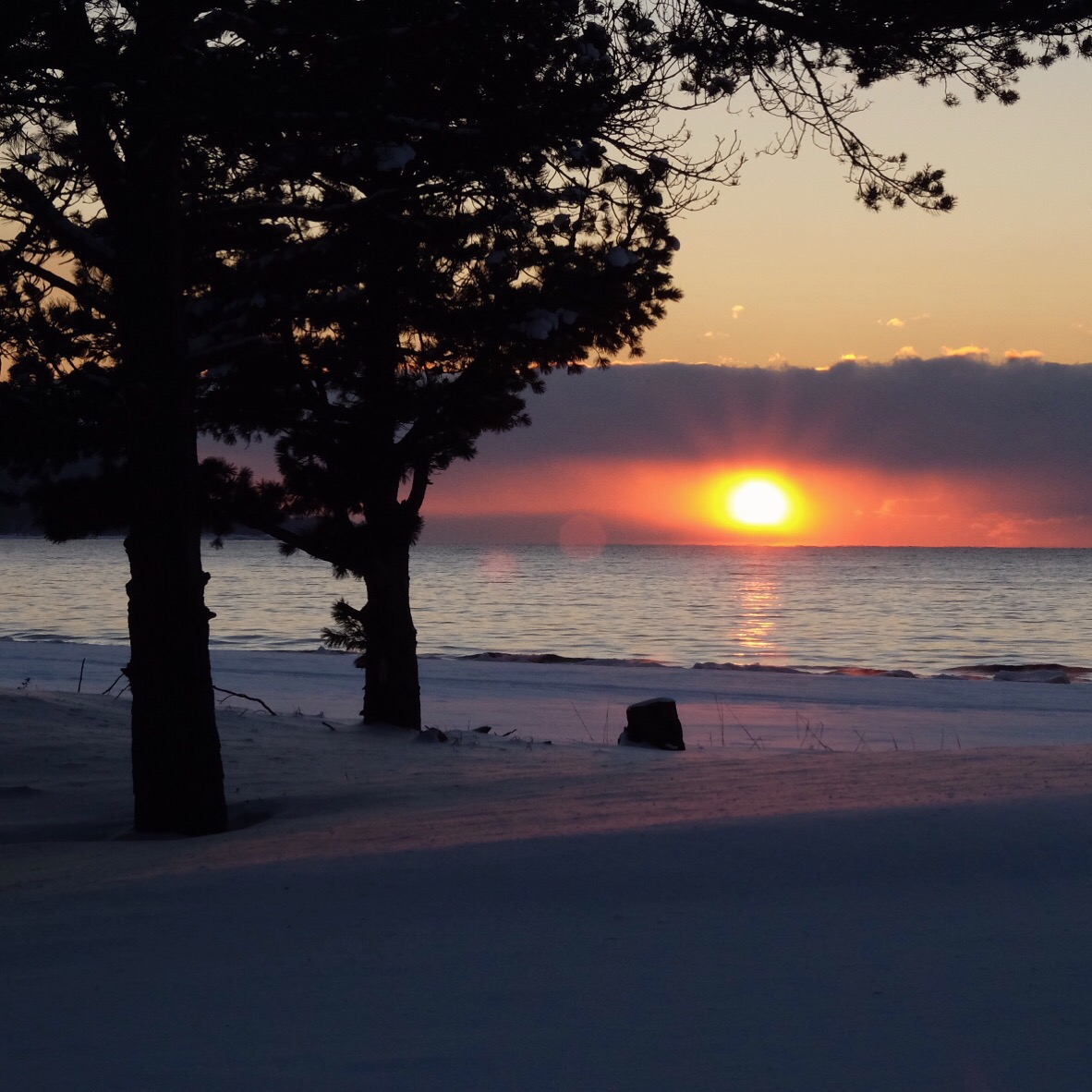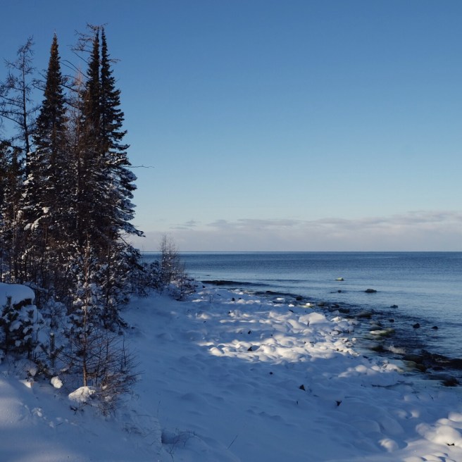 Lo specchio blu delle acque del lago non ancora ghiacciate contrasta in maniera netta e spettacolare il bianco, i larici su un lato della collina sembrano disegnati da un matematico, perfetti nella loro geometria, sotto di noi un lembo di spiaggia si insinua appuntito a rompere la dualistica cromia del lago.