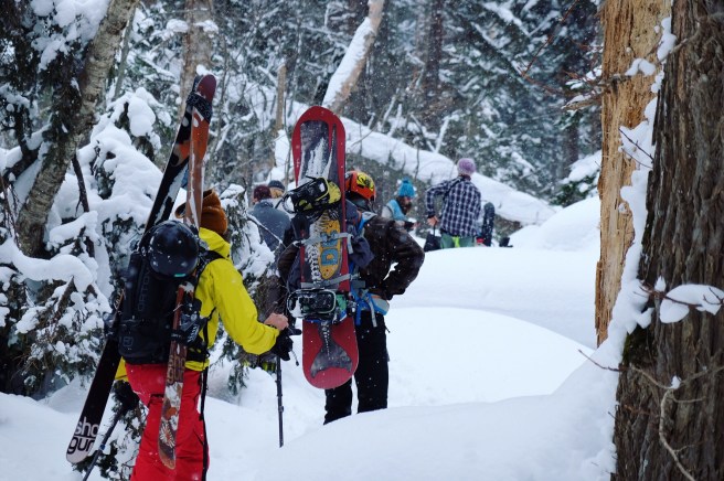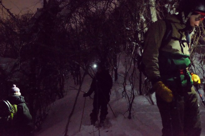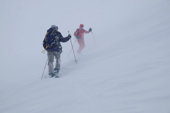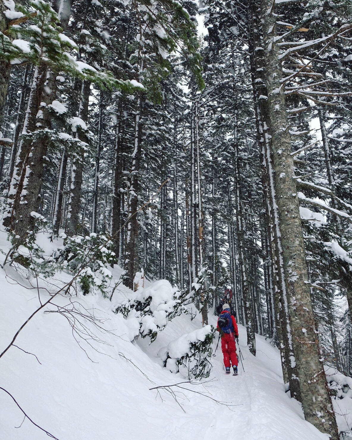 “Se il tempo non è dei migliori però ve la sconsiglio” era la seconda parte del suggerimento, ma a noi non era interessato ascoltarla. La sete di avventura era ormai tornata, troppo tardi per dubbi e ripensamenti, mettiamo le pelli e iniziamo a salire. Lo scricchiolio della neve sotto gli sci è l’unico rumore udibile nel primo tratto in mezzo al bosco ovattato, e in fila come formiche colorate risaliamo il morbido pendio ai piedi di svettanti secolari abeti.