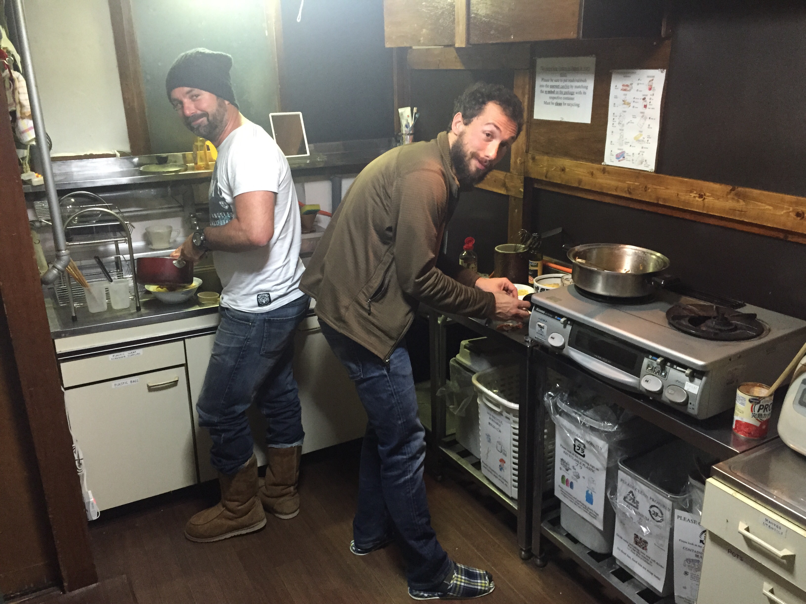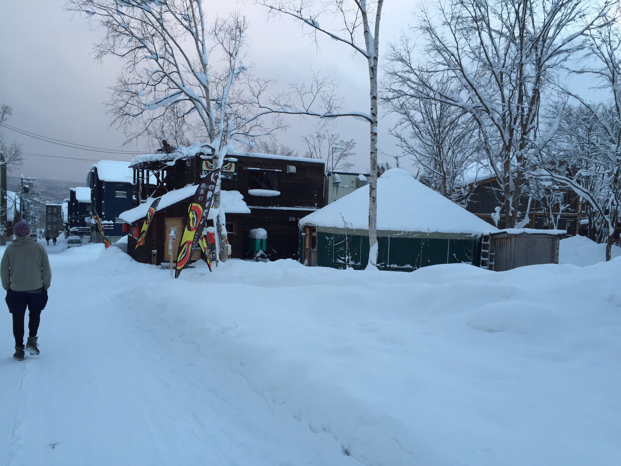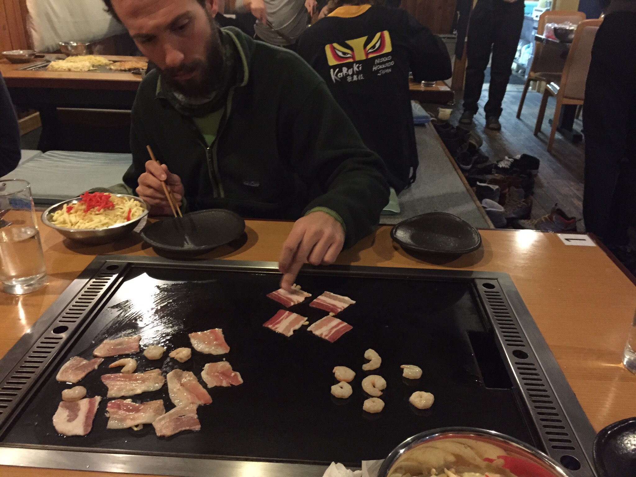 Appena siamo arrivati, a fine novembre, abbiamo iniziato a lavorare di mattina in un cantiere. Una casa (quella che poi è diventata Kutchan Kitchen) che aveva bisogno di essere sistemata. Ci siamo inventati la posa in opera di un pavimento, abbiamo aggiustato serramenti e finestre, imbiancato e scartavetrato ogni angolo e da metà dicembre siamo stati spostati nel ristorante Kabuki 1 (più economico, in cui ogni tavolino ha un “teppan” e i clienti si preparano da soli la cena) e Kabuki 2 (all’interno di una grossa yurta, con due grossi “teppan” centrali dove due chef cucinano).