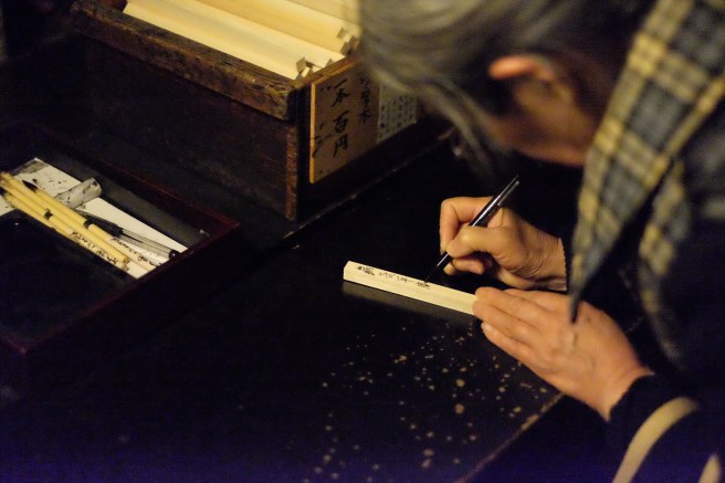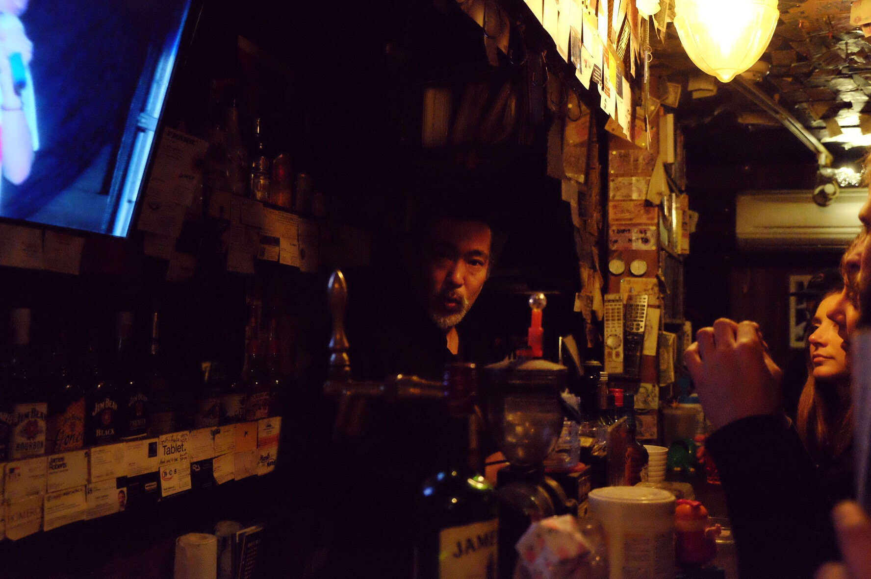 Il barista segue indicazioni per preparare un NegroniUno dei microscopici locali del quartiere Golden Gai, dove si entra, si beve e si esce.Sushi bar