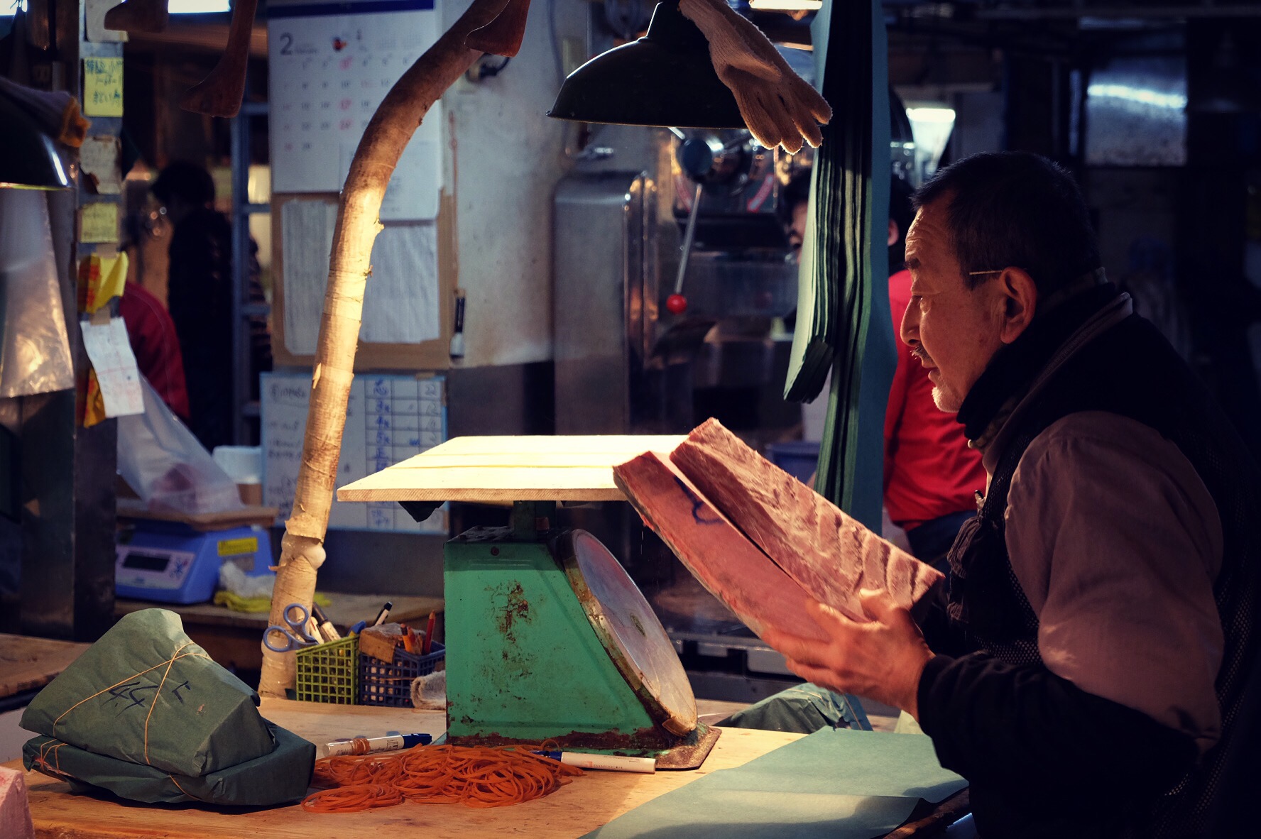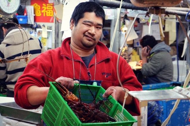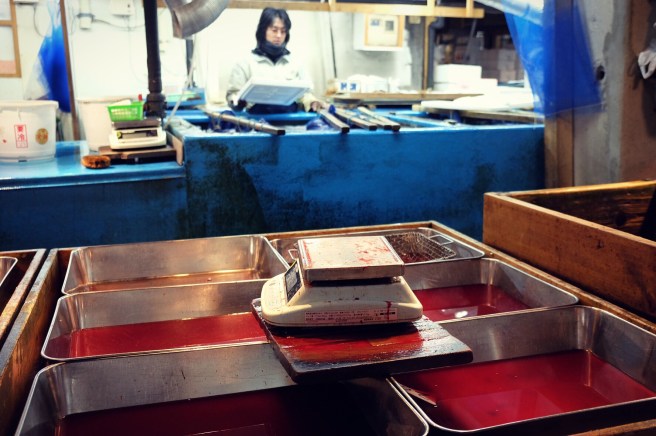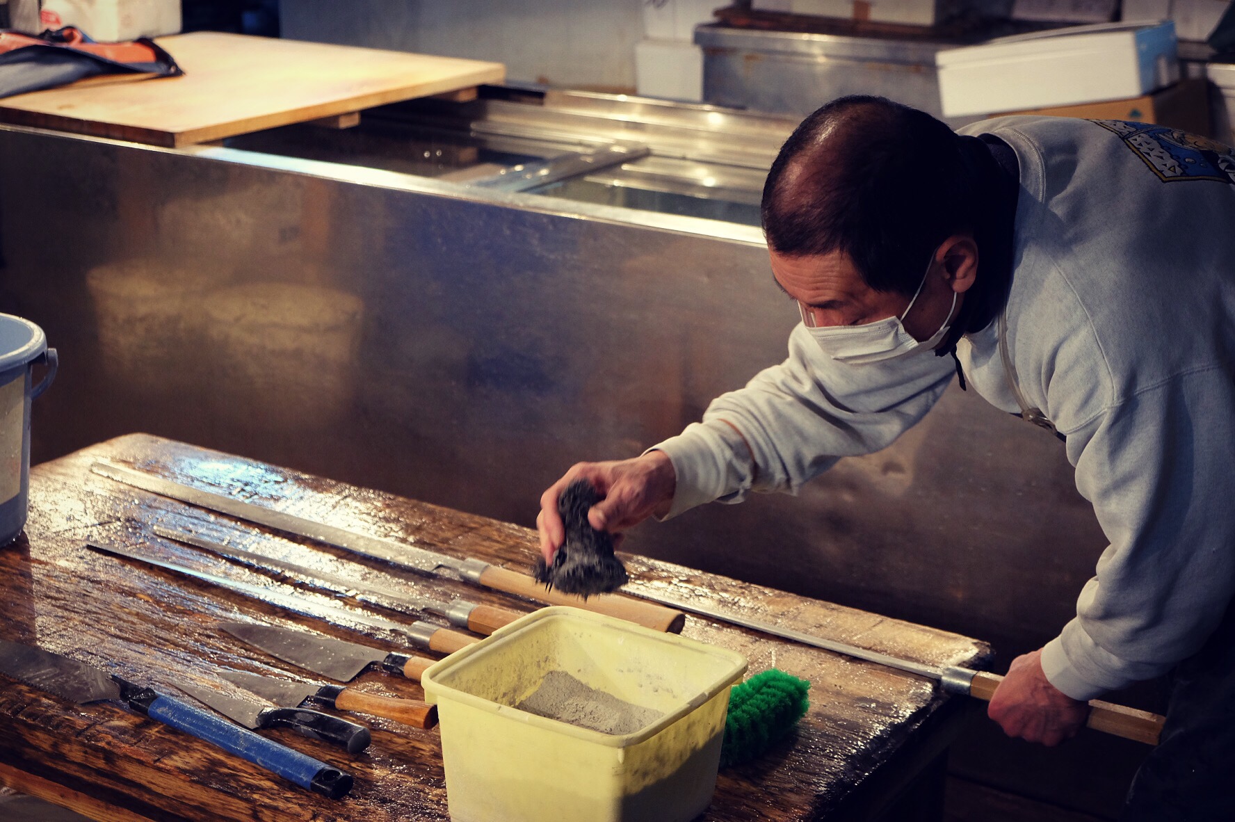 Uno scorcio di una bancarella nel mercato del pesceAffilatura di coltelli sempre nel mercato del pesce