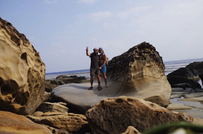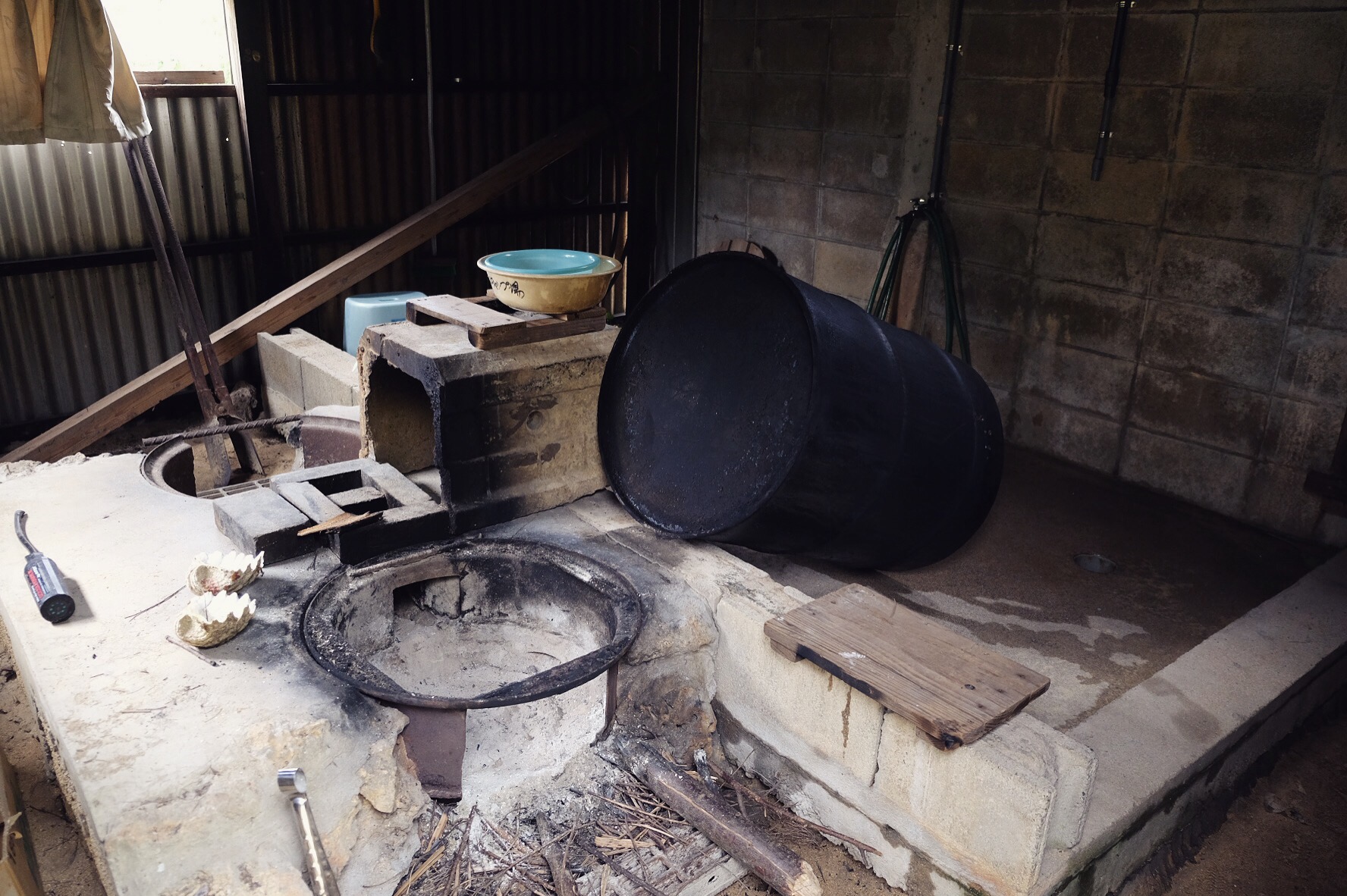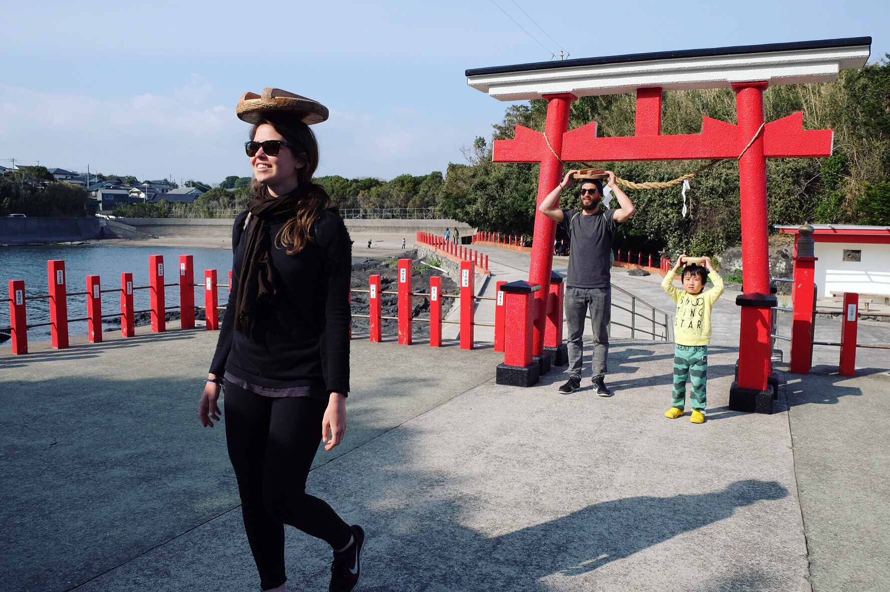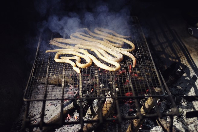 Approfittiamo della bassa marea e sotto la guida silenziosa e sorridente di Kaneco scaviamo nel bagnasciuga in cerca di vongole. Lui le prepara con sake e aceto, noi olio e aglio e ci condiamo gli spaghetti. Nell’acqua invece raccogliamo il “mosuku” – un alga marroncina e viscida – e non avendo minimamente idea di che farne, prendiamo spunto dal nostro maestro: ginger e salsa di soia. Oishi! (delizioso in giapponese)