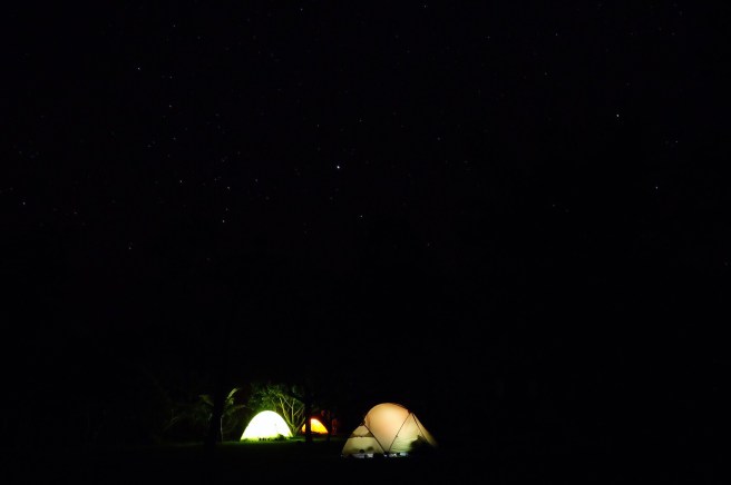 Cerchiamo di rassicurarci sulla tenuta della nostra tenda mentre nel cuore della notte pare che qualcuno abbia direzionato un idrante e una macchina del vento contro di noi. Il frastuono dello scroscio ci impedisce di parlare a bassa voce.