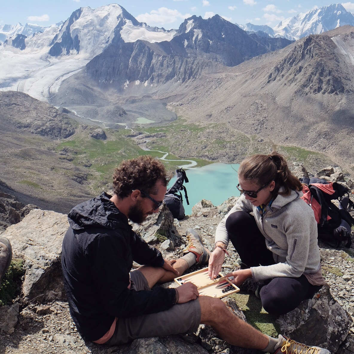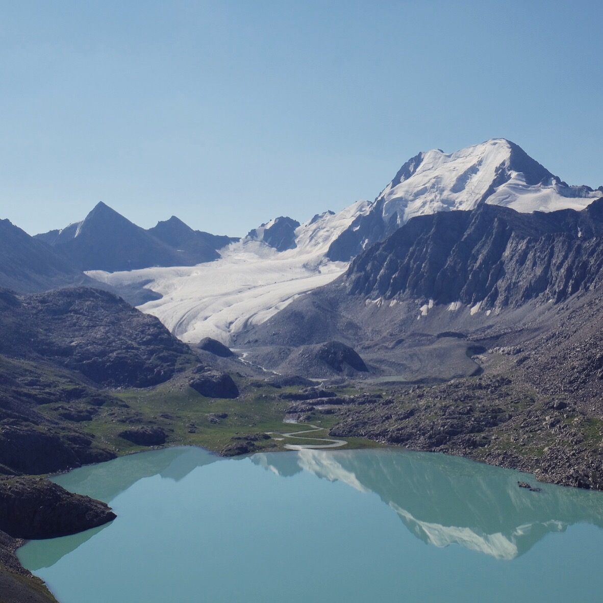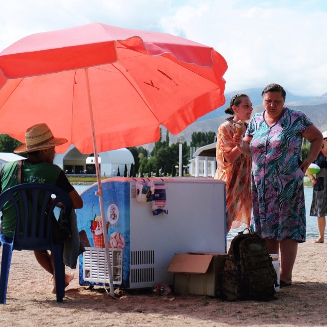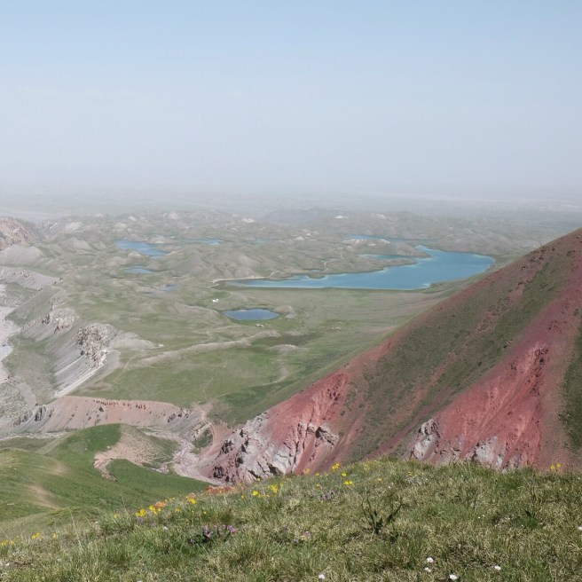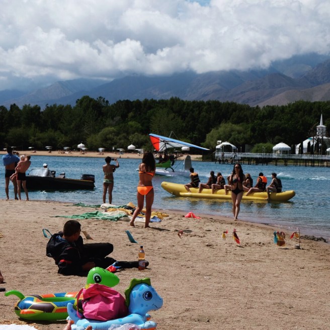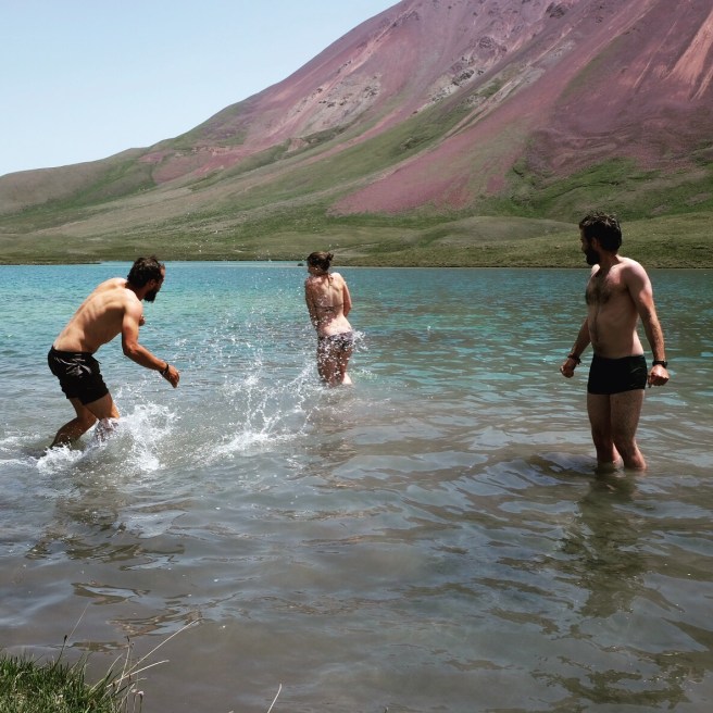 Un timido sole fa capolino al mattino seguente e fino a mezzogiorno ogni ramo o sasso del campo viene preso per uno stendino. Raggiungiamo il lago Ala-Kul dopo due ore di fatica vera – con pausa tè a metà strada offerto da un gruppo di siberiani altrettanto affaccendati nelle pratiche di asciugatura – e il panorama è davvero mozzafiato.