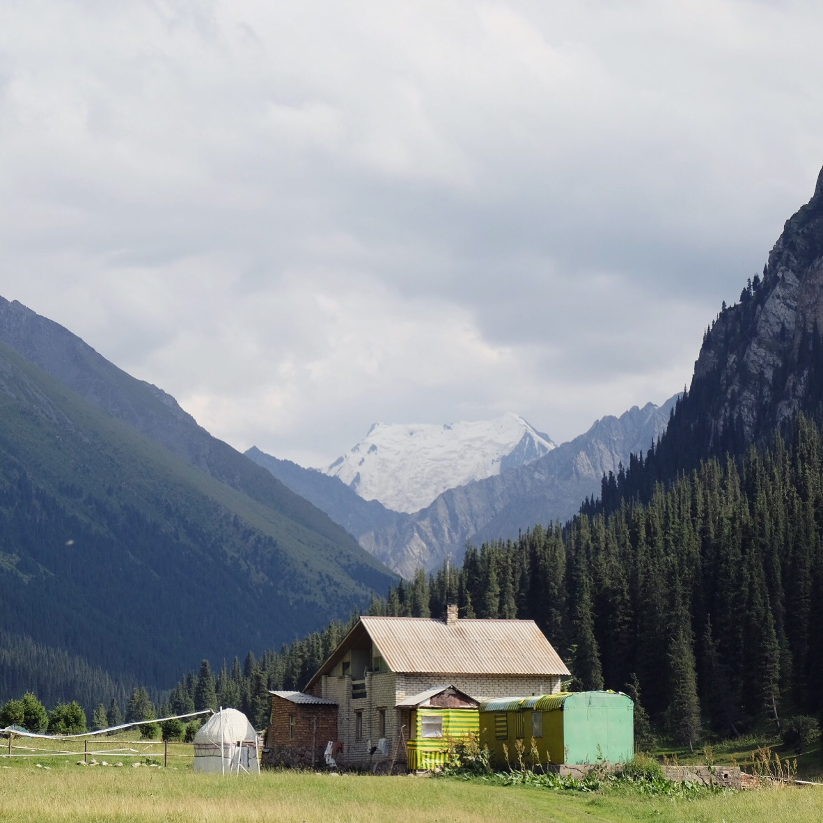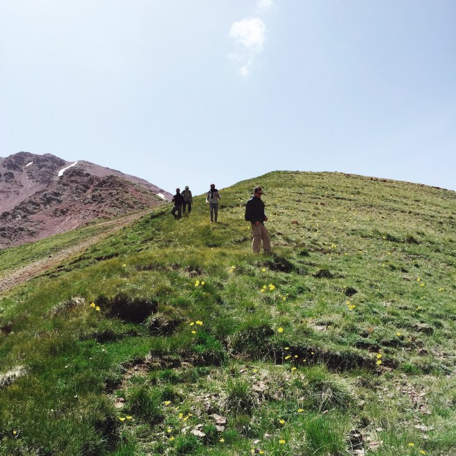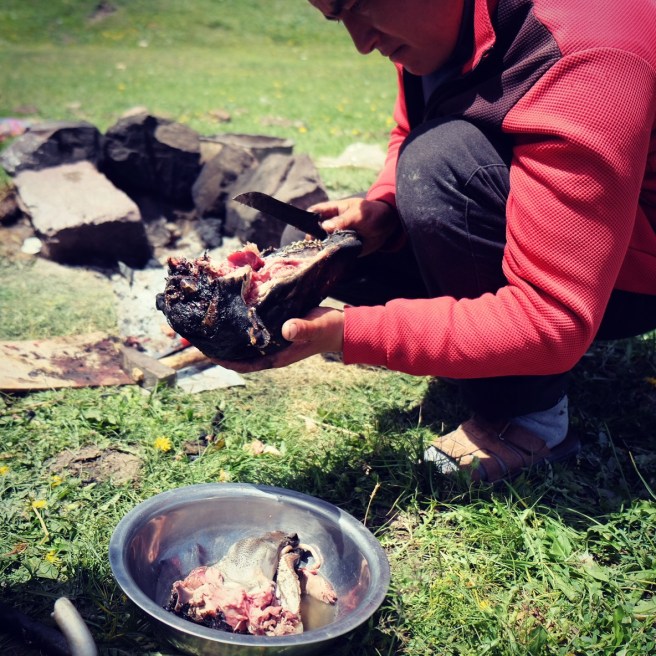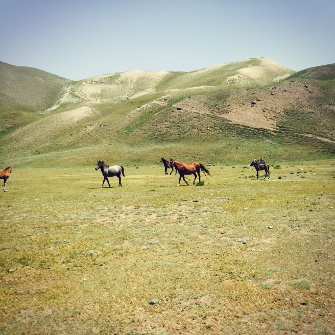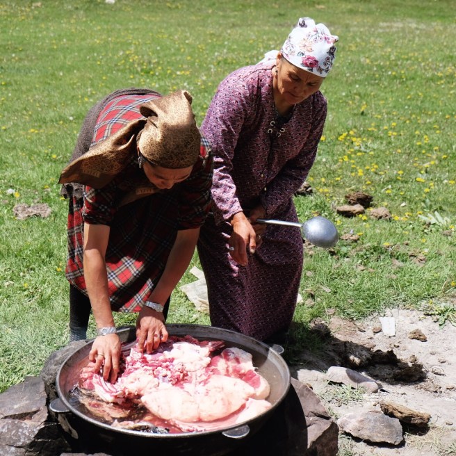 La “debole pioggia” delle previsioni meteo non era che un subdolo eufemismo e appena iniziamo a camminare ci ritroviamo sotto una valanga d’acqua, con i peli delle braccia rizzati dai fulmini e con rivoli di acqua che ci scorrono sulla fronte, sul naso, ci dissetano mentre annaspiamo e le scarpe diventano ferri da stiro. Ma non siamo soli. Insieme ad altri malcapitati riusciamo a raggiungere Kurgak-tor dove c’è una capanna di legno (non immaginatevi un rifugio svizzero) e gocciolanti e infreddoliti ci strizziamo e denudiamo per metterci i vestiti asciutti. Non abbiamo foto perché un iPhone allagato in una tasca ha smesso di collaborare e ci siamo ben guardati dal tirare fuori la macchina fotografica….